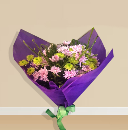 Beautiful Selection Of Chrysanthemums, Baby’s Breath & Leaf To Symbolize Purity & New Beginnings, Cheerfulness & Appreciation. The Bouquet Also Conveys Gratitude, Love, Purity, Or Admiration.